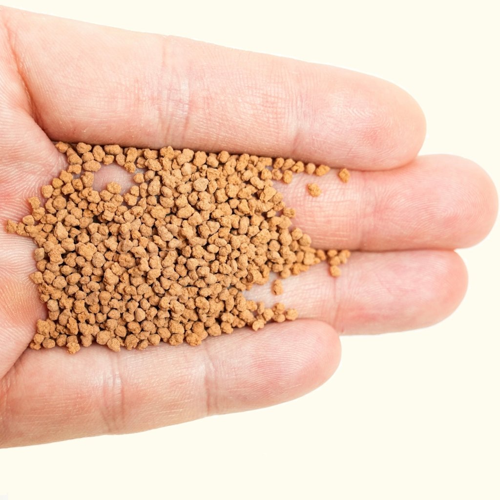 Magic Nuggets are a floating crumble with the same recipe as the Magic Small Fish Feed. This makes it easy to transition fish from the small feed to a variety of sizes by crumbling it in your fingers as you feed. This is optimal for community tanks as there are a variety of fish and mouth sizes. One food can feed fry up to larger fish like goldfish and cichlids. For larger fish, simply feed it whole. For smaller fish, crush it between your fingers to crumble it down into a powder. This food floats and then can sink when it is saturated, or caught by flow from filters.