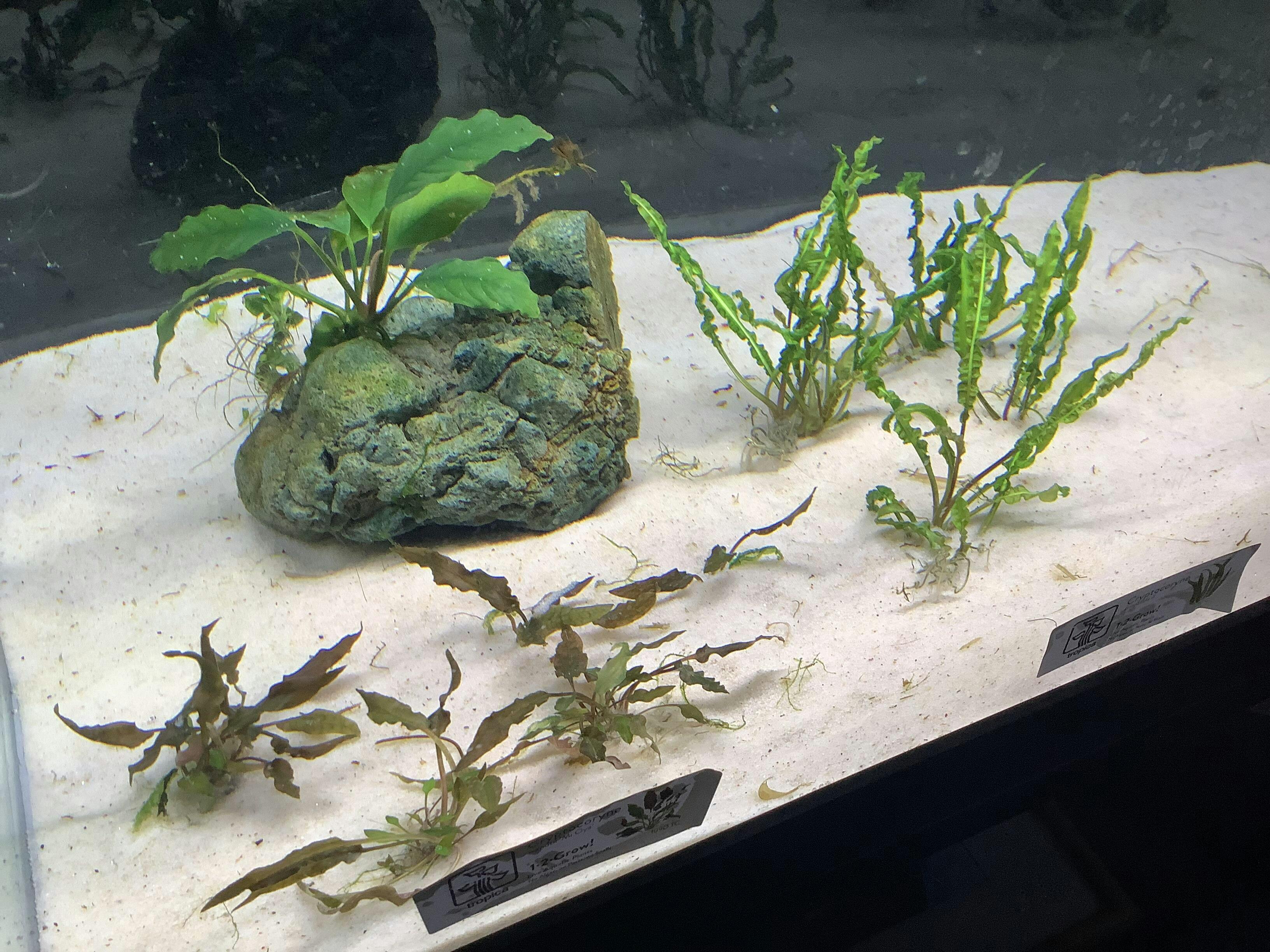 Cryptocoryne crispatula var. balansae is from the limestone mountains of Southern Thailand, where the water can be very hard. It is not very demanding, but appreciates a nutritious substrate and good light. The leaves, which can be either entirely green or a maroon color, grow from 7" to 23" long, and the single rosette plant can grow about 6" wide.