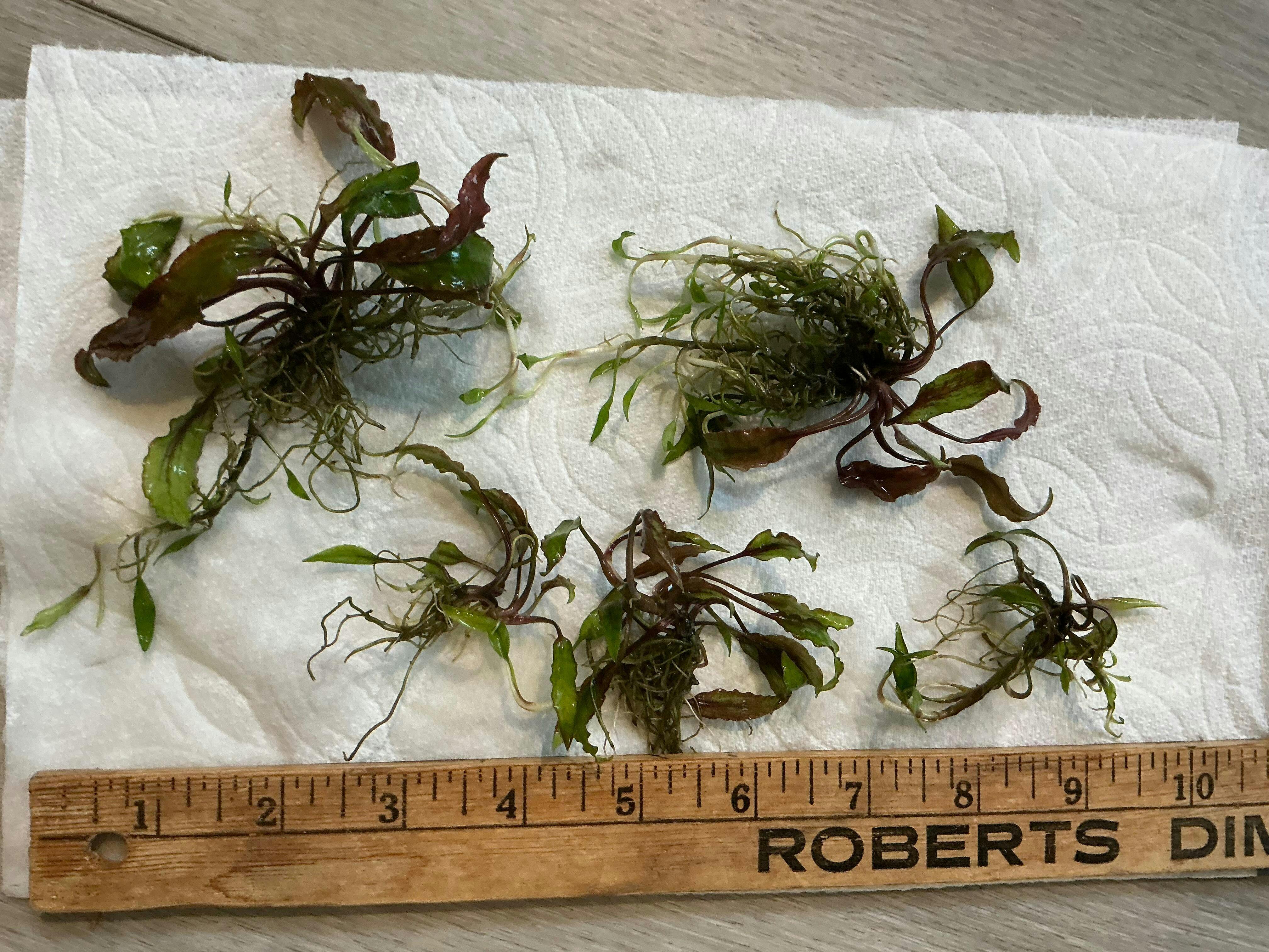 Cryptocoryne nurii is a rarer crypt species that has the same size and ruffled leaf texture as C. wendtii but has distinctive spotting that looks like tiger stripes. This low light plant is easy to care for and likes to feed on root tabs and nutrient-rich substrate. Its coloration can vary from bronze to green, depending on the lighting and fertilizer. On average, it can reach up to 8 inches (20 cm) tall and is often planted in the midground of tall tanks or background of nano tanks.