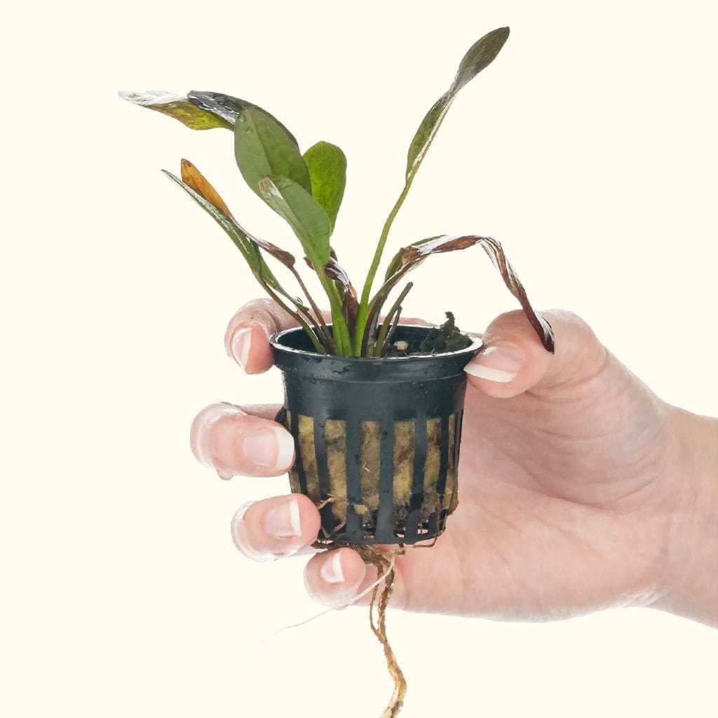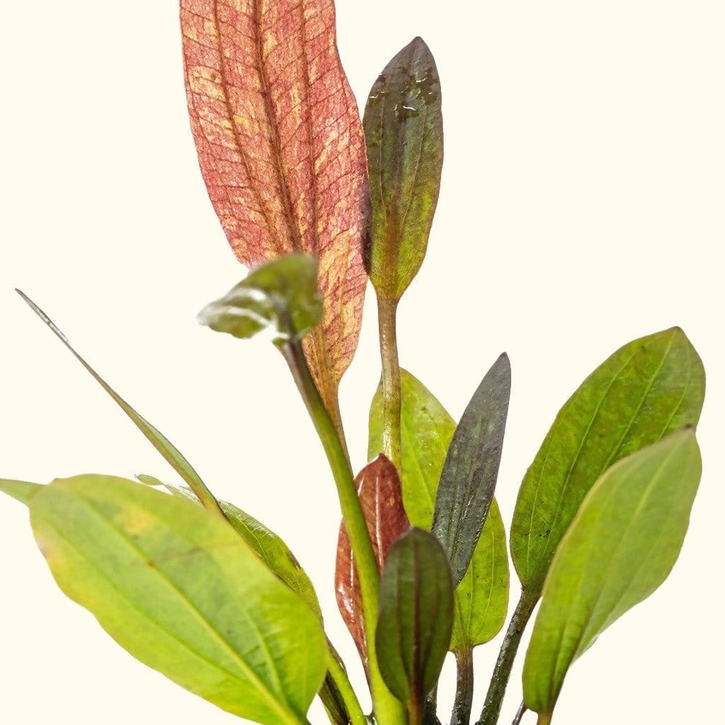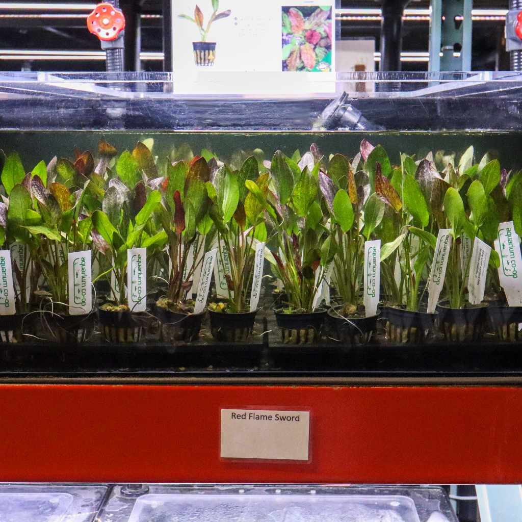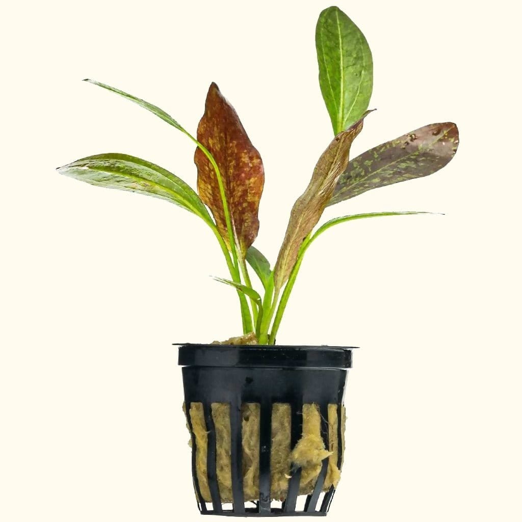 Red flame sword is a very impactful aquarium plant that is easy to grow. It can have green, red, or bronze-colored leaves, creating an interesting and eye-catching spotted pattern. Medium lighting or higher would be ideal for this plant to thrive. Red flame sword plants can get quite large if left untrimmed and therefore look impressive as a background plant in larger aquariums or even a center piece plant in nano tanks.