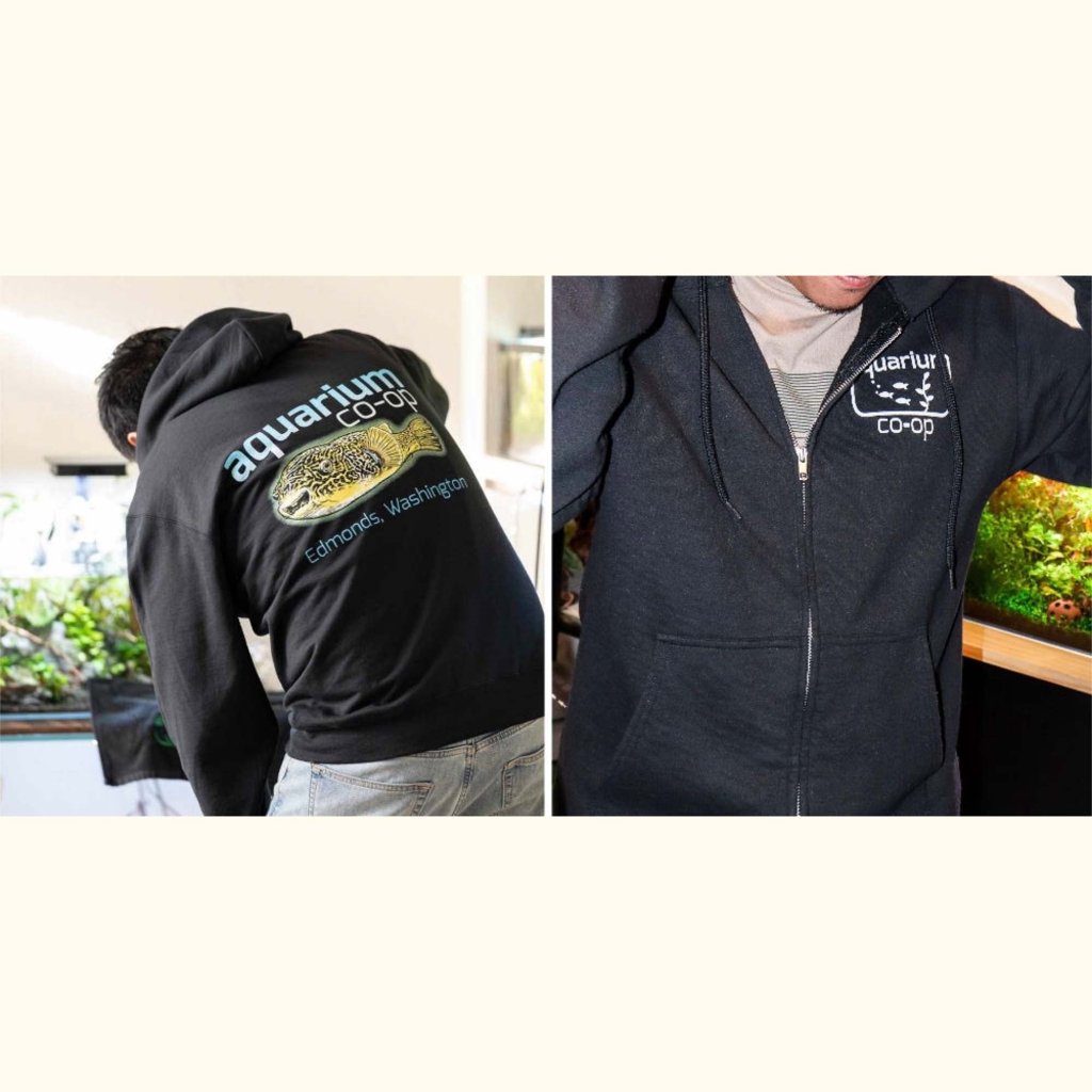 Stay warm and comfy with our jet black fleece hoodie. A white Aquarium Co-Op logo is printed on the front left side, while the original Aquarium Co-Op logo is prominently featured on the back with an Mbu puffer and the text "Edmonds, Washington" (the location of our retail store). Plus, it comes with a sturdy metal zipper, black drawcord in the hood, and two pockets on the front. We can't wait to spot our fans wearing this hoodie at conventions or the Aquarium Co-Op retail store.