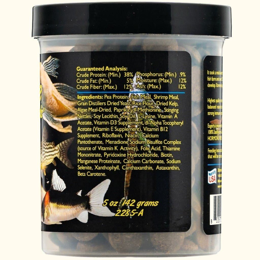 This food contains spirulina blue-green algae, green pea and even wood products to encourage the natural eating habit of plecos and other catfish. Xtreme Bottom Wafers are also great for loaches, corydoras, shrimp and even livebearer fry based on our own testing. It holds it shape underwater a bit better than competing products as well. It is fast to sink and slow to dissolve.